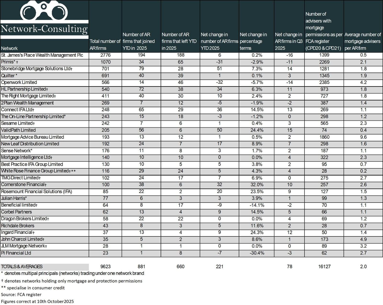 Network Consulting’s latest mortgage network table for Q3 2025 paints a clear picture of a market in motion. With 9,614 Appointed Representative (AR) firms and 16,127 advisers holding mortgage permissions, the AR intermediary sector continues its steady upward trajectory. This marks a sustained rise from 9,412 firms and 15,880 advisers in January 2024.